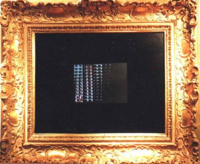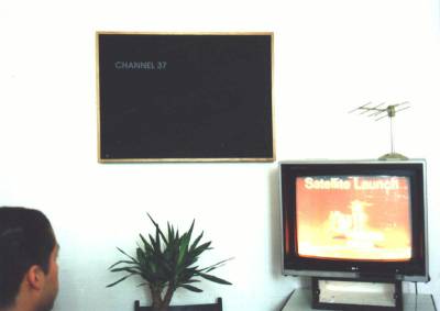 The second viewpoint was a monochrome canvas. The entire hardware was installed in the picture frame. In addition, a small transmitter was built, which sent on the television channel 38 a picture from the viewpoint to the television that could be placed near the picture. The “channel 38” nodes functioned just like the LCD screen; once a day, the connection to the network was established via a normal telephone line, and the current program was played in a slideshow.