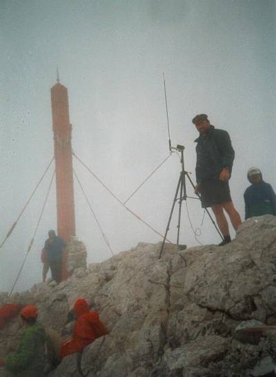 During the Tonga Exedition in the "Tote Gebirge"] a packeradio transmitter was taken for the short wave area. On the photo you see the transmitting antenna next to the summit of the “Grosser Priel” in Upper Austria. One connection was established over 400 km to Nuremberg and one to the Baltic Sea more than 1000km.